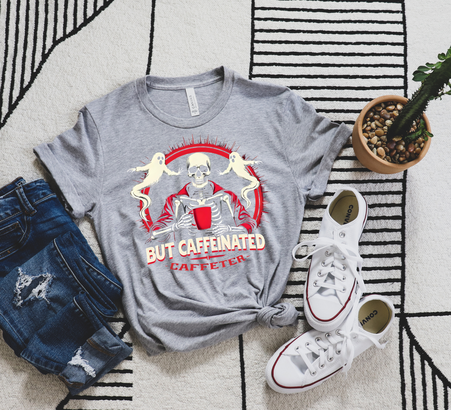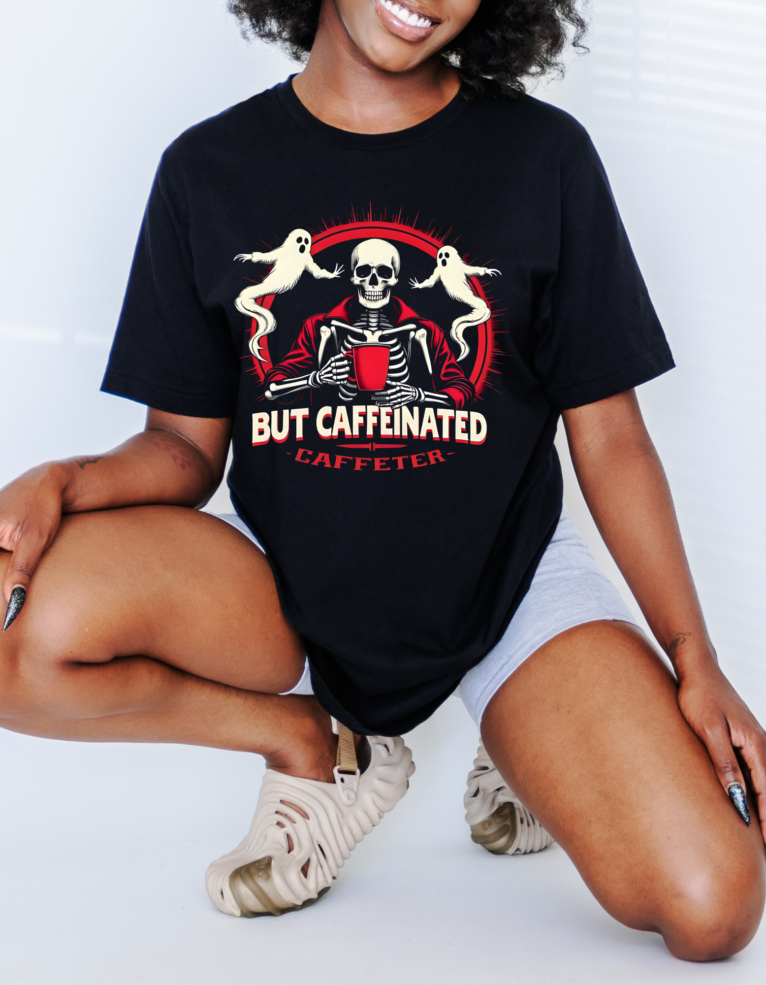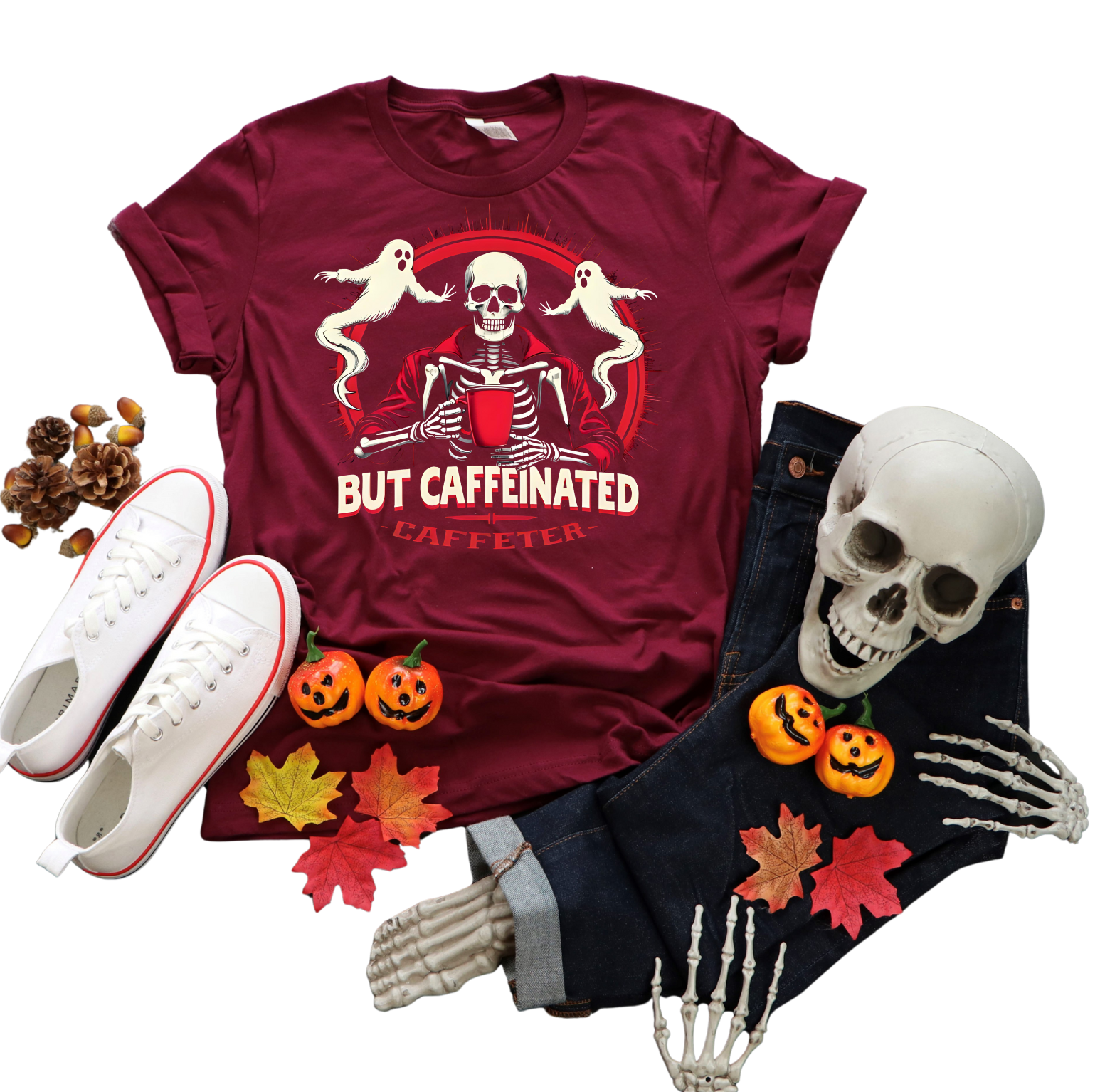 Halloween Coffee Skeleton T-Shirt – “But Caffeinated” Funny Ghost Tee